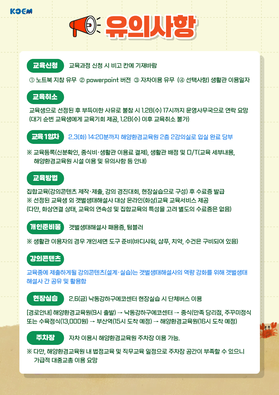 안녕하세요. 갯벌생태해설사 운영사무국입니다. 「갯벌생태해설사 강사역량 강화 과정」신청 접수를 받습니다. ✅ 교육 과정 안내 1️⃣ 교육일자 : 2026. 2. 3.(화) 14:20 ~ 2. 6.(금) 16:00 예정 2️⃣ 교육장소 : 해양환경교육원 강의실 2층(부산광역시 영도구 해양로301번길 23) 3️⃣ 교육비용 : 무상(단, 교육시설 이용에 따른 중식비(6,000원/1식) 및 숙박비(16,000원/1일)는 개인 부담) 4️⃣ 교육내용 : 강의 전달 스킬, 보이스 트레이닝, 강의 콘텐츠 설계 이론 실습, 강의 경진대회 및 피드백 평가, 낙동강하구에코센터 체험학습 ※ 교육내용은 여건에 따라 변동될 수 있음 5️⃣ 모집인원 :「갯벌법」의거 갯벌생태해설사 자격을 취득한 자 대상 선착순 35명 ✅ 신청 안내 1️⃣ 신청기간 : 2026. 1. 19.(월) 10:00 ~ 1. 21.(수) 18:00 2️⃣ 신청방법 : 아래 바로가기 링크 클릭 - 신청서 '기타사항'에 개인 노트북 지참 여부 입력 필수‼️ ✅ 기타사항 - 수료기준 : ① 출석률 80% 이상 ② '강의 콘텐츠 설계·실습'자료 제출 - 교육원 입소 시 준비물 : 갯벌생태해설사 패용증, 텀블러, 개인 세면도구(생활관 이용자, 바디샤워, 샴푸, 치약은 구비되어 있음) ✅ (문의사항) ☎️ 051-400-7780 또는 ☎️ 051-400-7765 .  |